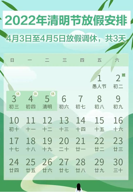 根据国家相关法定假期规定,结合公司实际情况,2022年清明节放假安排如下:4月3日(星期日)至4月5日(星期二)共计放假3天,4月2日(周六)正常上班