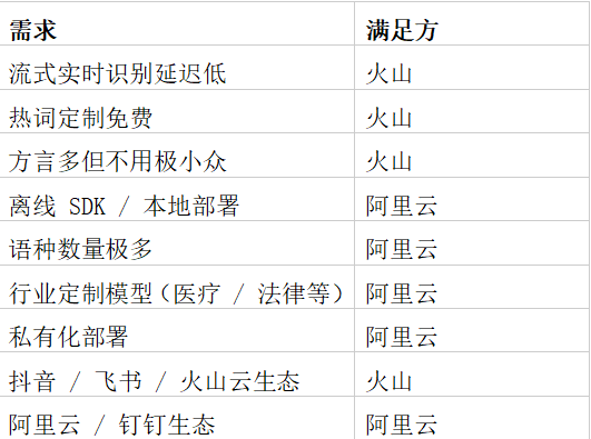 → 优先火山ASR(延迟低、热词免费、性价比高)