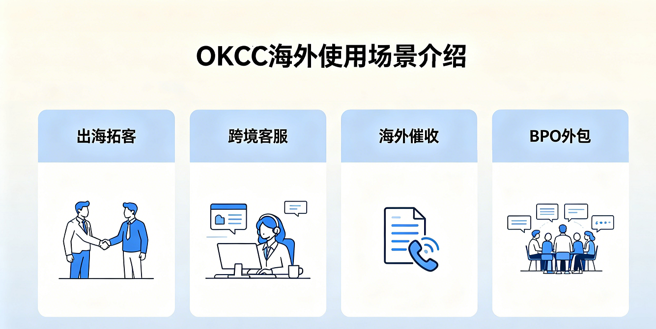 OKCC 海外核心是跨国呼叫中心 + 国际外呼 / 呼入 + 本地化号码,主打出海拓客、跨境客服、海外催收、BPO 外包四大类场景,稳定、合规、成本低,适配全球业务。
