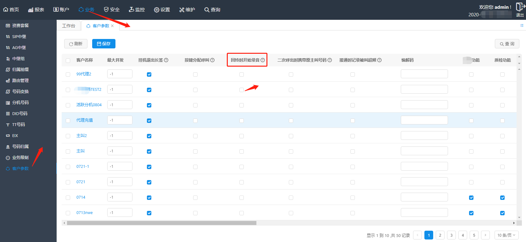 1.1 全程录音和接通录音:全程录音就是回铃声也录入,接通录音是不录入回铃音。系统为了节约性能,方便特殊场景应用,可以根据需求设置是否录回铃音。具体设置见下图:运营界面--业务--客户参数:勾选目标客户的“回铃时开始录音”。目前默认是不勾选“回铃时开始录音”,表示坐席接通后开始录音,相对节约性能。