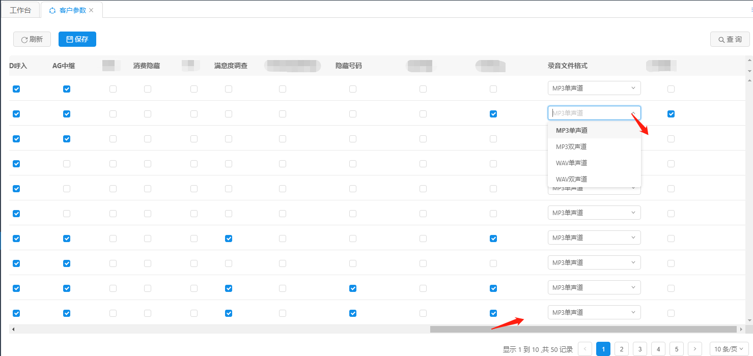 1.2 支持多种录音格式:系统录音支持四种录音格式,分别是:MP3单声道、MP3双声道、WAV单声道、WAV双声道。相比mp3格式的高压缩率,wav格式提供客户更好的音质。 系统默认采用的是MP3单声道格式录音。具体设置也是在客户参数页设置,具体见下图:运营界面--业务--客户参数:在目标客户的“录音文件格式”下选择。这里不再详述。
