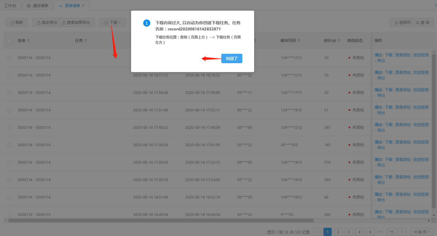 系统可多处录音播放、导出,【通话清单】页面和【录音清单】均支持录音的播放导出。其中坐席界面的【通话清单】和【录音清单】支持下载; 企业界面的【录音清单】、【标记历史】、【标记结果】页支持录音下载。当客户下载录音数目超过100条,系统将会把所有录音文件生成一个压缩包,客户可以在web登录页面“查询-->下载任务”中进行下载。