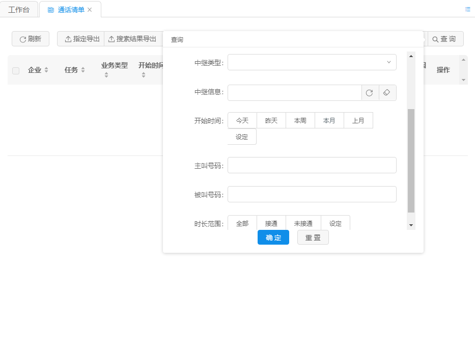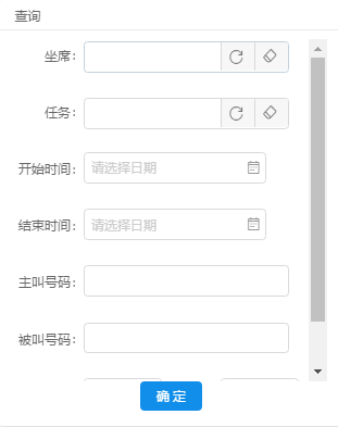 OK-CC系统对于坐席班长,支持的录音查询功能主要包括按坐席、任务名称、开始结束时间、主被叫号码、时长范围以及多条件联合查询,其中按照工号、主被叫查询支持模糊查询,如下图所示。