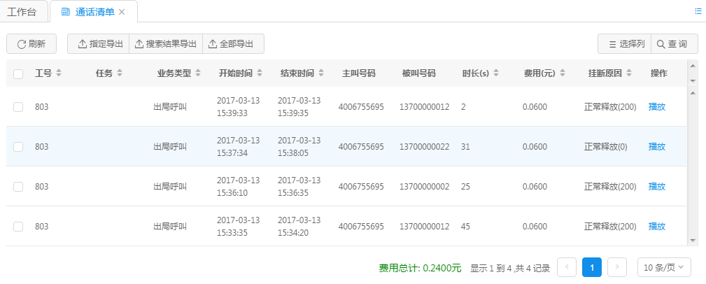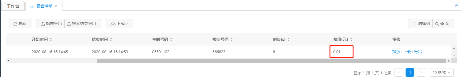 在客户所选的资费套餐中可以修改录音业务的计费规则,系统默认录音业务的计费规则计费费率为0,所以录音清单页面显示计费为0。将录音业务的计费费率修改为其他(如0.01),再呼叫,查看到录音清单上显示如下图: