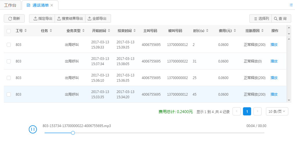如下图所示,打开录音清单页面,直接点击“播放”按钮,通话录音即可播放。录音播放时,页面底端会展示录音的播放进度条,而且可以对播放进度进行控制。