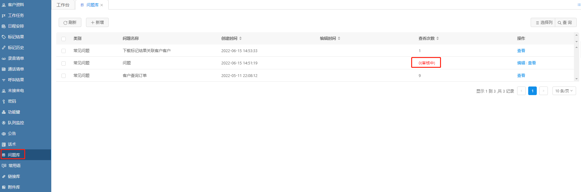 话务员在日常工作发现问题,在通过查询来记录辅助自己进行业务。在问题库-“新增”,填写下相应的问题和答案,点击保存。就新增加了一个问题。