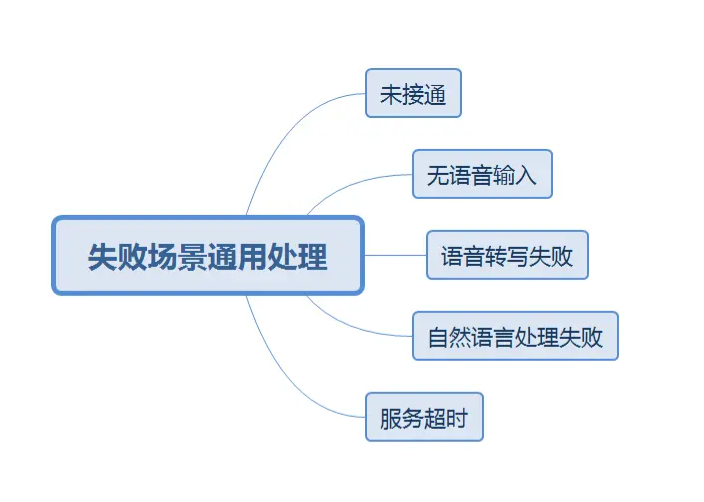 (4)自然语音处理失败:这种失败场景一般是由于用户表述导致的,用户表述的不清楚,或者连续导致解析低于阈值,而没有结果,这种情况的处理与语音转写失败一致。