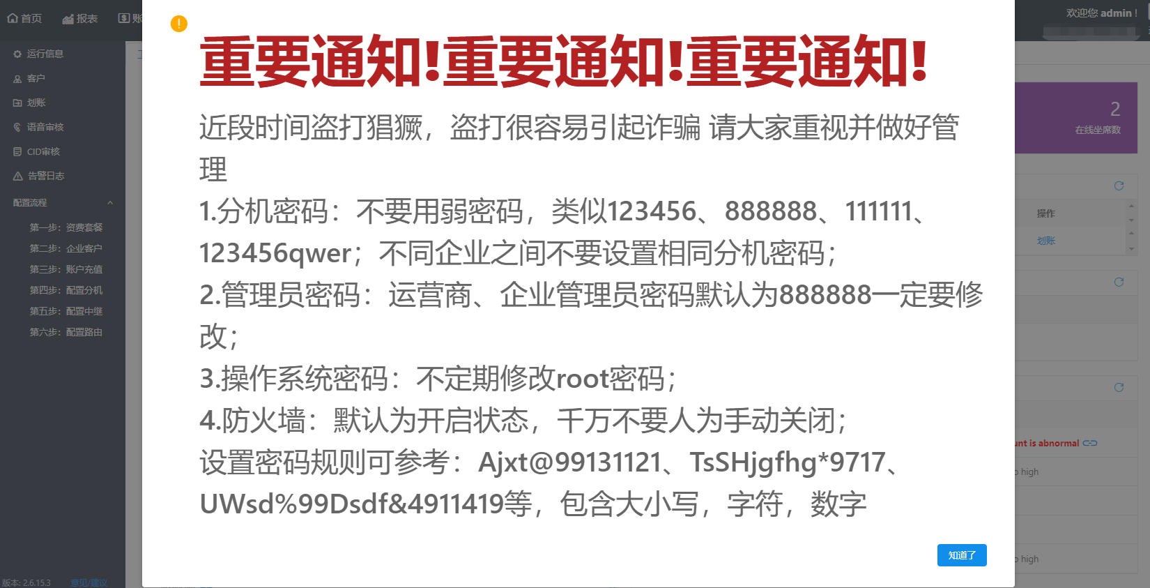 OKCC系统登录即做醒目的弹窗提醒,提高管理人员的安全意识。