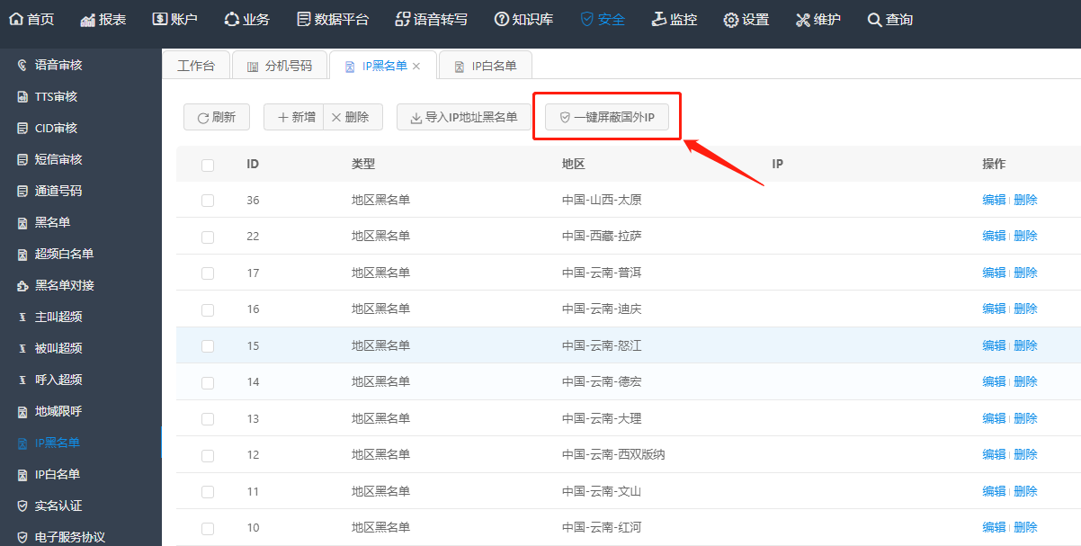 通过IP黑名单功能,限制访问呼叫中心以及注册SIP分机的来源地址,支持按IP以及区域来添加IP黑名单。