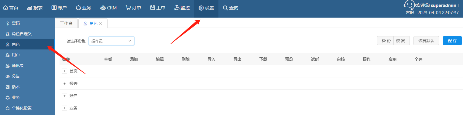 注:配置企业客户的权限,需跳转到企业账户的设置->角色处,配置权限
