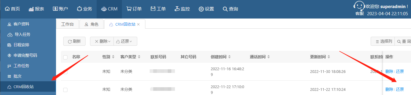 对于回收站的数据,管理员可以选择还原,会重新回到客户资料中。(该逻辑可参考Windows回收站)