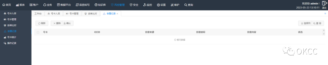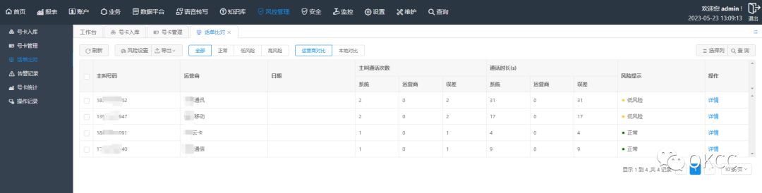 ② 运营商对比,将OKCC的系统话单和运营商的记录进行对比并统计误差值统计完成后对误差超过阈值的卡进行告警,对风险卡进行停机处理。