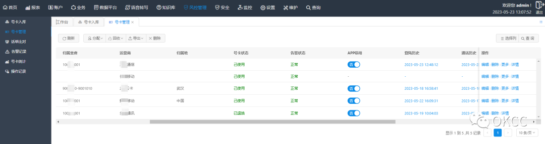 目前SIP,回拨,小号,SIM卡四块线路都可以在OKCC系统中进行统一的资源整合和运营,APP风控管理模块的上线,更加方便了SIM卡的运营管理。