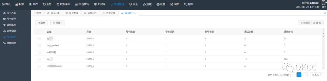 呼叫中心会按照企业维度记录使用的号卡数量、活跃度情况、通话数和分钟数进行统计。通过统计分析,可以观察客户的使用及流失情况,对号卡进行合理的分配和管理。