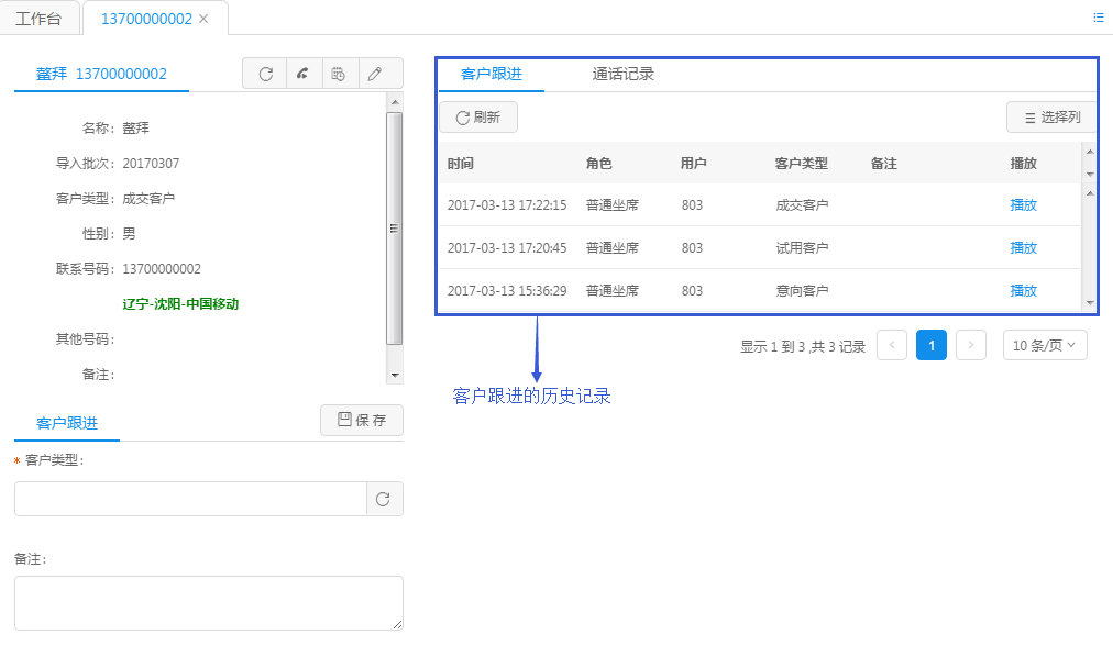例如下图所示,客户跟进展示了该客户资料的历史跟进历程,每做一次客户资料标记,此处都会生成一条客户资料跟进记录。 客户历史跟进包括了跟进时间、跟进的坐席、跟进类型,能够形象地体现出该客户的跟进历史。