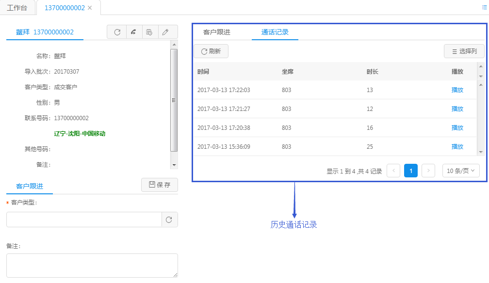 这里展示了该资料的所有通话记录,包括已接通与未接通。在这里我们可以试听每一次的录音内容,详细了解此客户的发展过程。这里包括每次通话时长以及与之联系的坐席,详细内容里如下图所示。