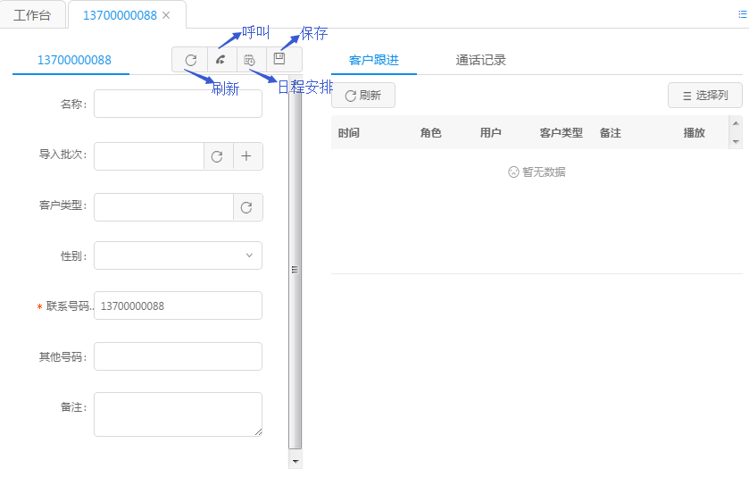 通过预览外呼、DID呼入、预测式外呼任务转坐席任意一种方式进行呼叫。如果客户资料无此号码,当发起呼叫或者呼叫转到坐席时,会看到坐席弹屏,如下图所示为DID呼入的弹屏。