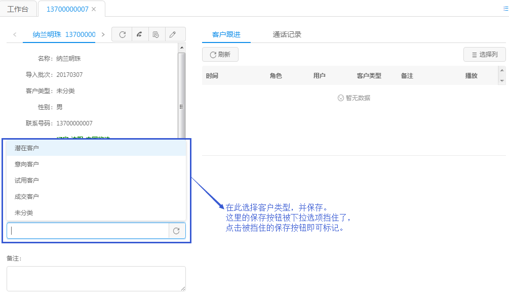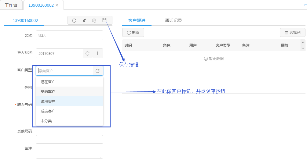 如果客户资料中已经有此号码,那么坐席页面会弹出例如下图所示的弹屏,弹屏展示了之前已经填写的客户资料的详细信息。如果需要再次对客户资料进行标记,选择客户类型并点击保存按钮,下图中的保存按钮被下拉选项挡住了,点此“保存”按钮即可进一步标记。