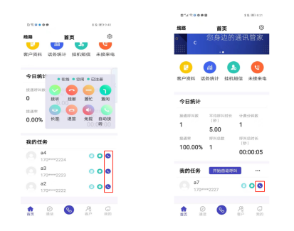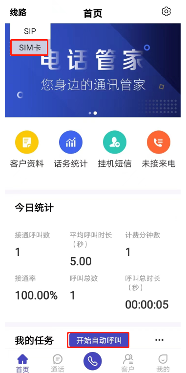 企业帐号在客户资料导入号码并分配给班组坐席,坐席APP登录后选择SIM卡,在我任务里展示客户号码,这时可点击“开启自动呼叫”按钮,执行APP自动呼叫。