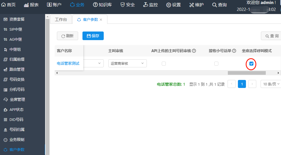 运营账户登录,业务---->客户参数,选择“坐席选择呼叫模式”。