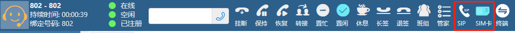 根据客户当前设定的线路模式,坐席页面展示相关控制按钮。以下坐席可选择SIM卡或SIP发起呼叫,如下图:
