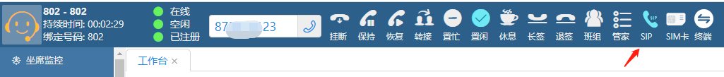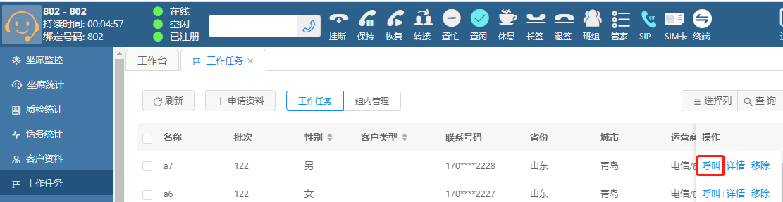 3)坐席选择SIP,在工作任务里点击呼叫。