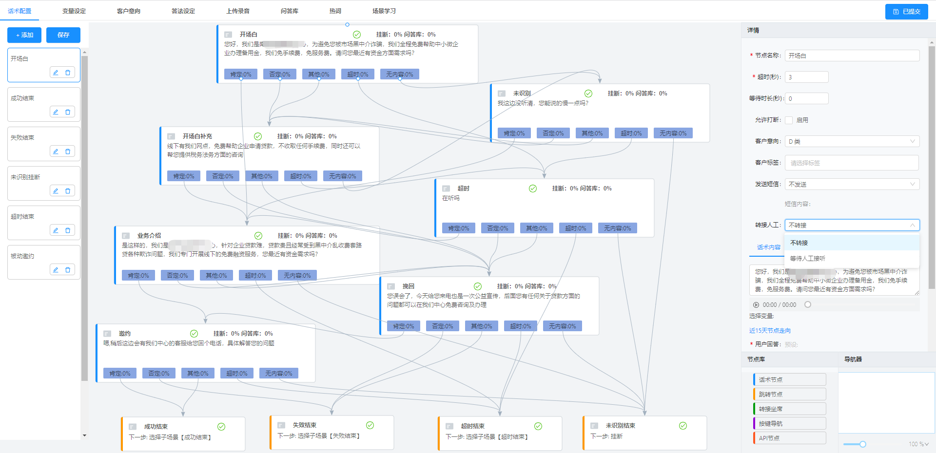 交互流程设计:在设计AI外呼的交互流程时,需要考虑用户的使用习惯和需求,尽可能简化操作步骤,提高交互效率。从上图就能看出,OKCC-AI的话术制作,利用拖拽的方法就能实现话术逻辑间的连接,简单直观。同时,在交互过程中加入一些趣味性和人性化的元素,可以增加用户的参与度和黏性。这个主要体现在话术用词造句的方面,什么样的词语和表达形式能让自己的客户更有兴趣,参与度更高,这个不仅仅是产品功能来实现的,还需要通过交互流程优化给客户带来更好的体验感。