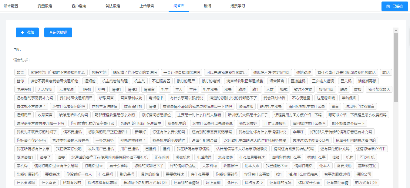 另外,有些语音机器人的话术可以设置多轮对话,就是同一个问题客户在问多次或者表达多次的意思都是同一个问题的时候,机器人可以给到不是完全相同的回答,不然会让对方察觉出来是电话机器人。所以,我们尽可能的把客户经常问到的几个问题都设置多轮对话。比如贷款这个业务,“贷款利息多少”这个问题就很容易被多次问到。