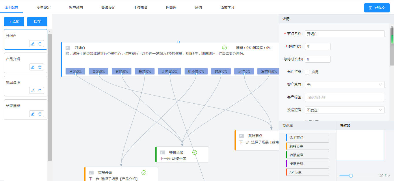 最后一点需要注意的是,在客户的问题回答完以后,语音机器人会根据前面主流程设置的内容,在被打断的地方接着往下表述,所以有些问答是要做跳转设置的。比如,在语音机器人刚讲完开场白,客户就说:你加我个微信吧,等空了发我个资料我看看。 这个时候回答完客户的这个问题以后,应该就走“成功结束”流程,结束对话了;而不是再回到被打断的流程接着讲产品介绍,这样就会有逻辑问题。