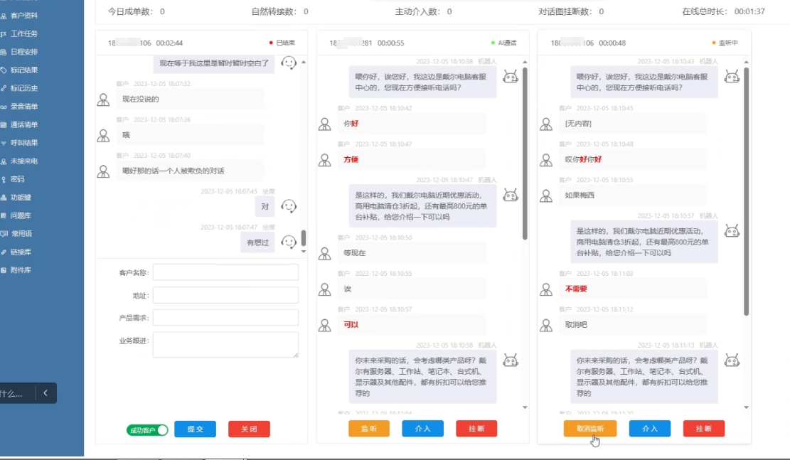 人机耦合是为真人坐席创造相同声音的分身机器人,机器人自动拨号并筛选出意向客户,坐席可实时监控/监听机器人与客户的对话,坐席随时无感介入接替对话,并做到介入前后声音相同,保证客户沟通体验。