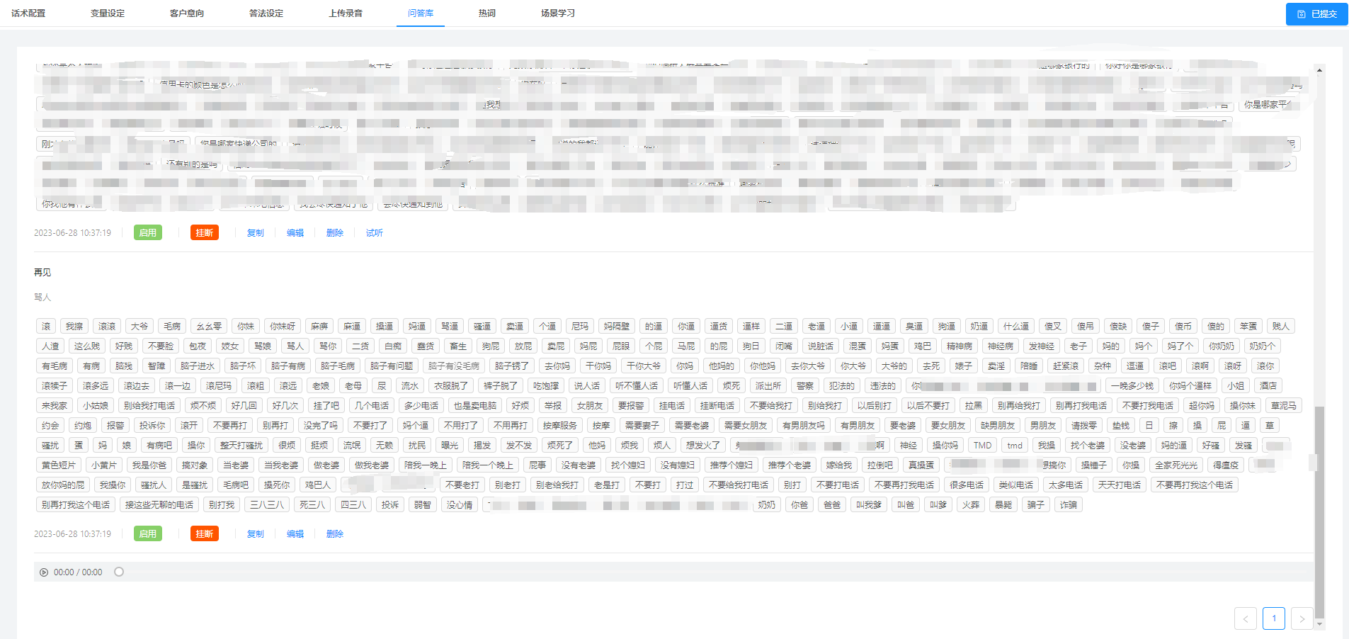 所以,说了这么多,怎么识别情绪呢?核心就是客户自己用语言表达出来了,然后系统给他翻译出来,我们机器人后台针对这种情绪的表达设好了关键词,触发对应的关键词,流转到对应的流程。比如设置了骂人的关键词,并且触发骂人的关键词,机器人就说,“不好意思,打扰了”,然后挂机!