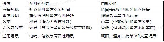 风险:可能因预测不准导致“无效呼叫”(如拨通后无坐席接听,需挂断)。