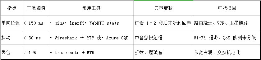‑ 自适应码率:WebRTC 开启 goog-adaptive-bitrate;SIP 话机可把 G.711 切到 G.729/G.722.2。