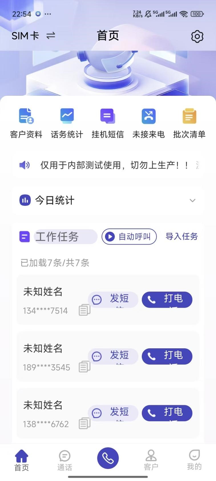 1. SIM卡直呼:登录APP后选择SIM卡,在"我的任务"界面点击客户号码即可开启自动呼叫。该模式支持线路切换(如SIP/SIM卡/回拨等),当一种线路不通时可手动切换其他模式。