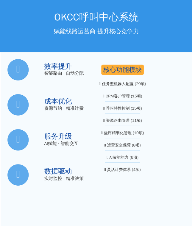 OKCC系统通过丰富的功能模块,帮助线路运营商突破传统盈利模式局限: