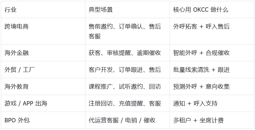 OKCC 海外核心是跨国呼叫中心 + 国际外呼 / 呼入 + 本地化号码,主打出海拓客、跨境客服、海外催收、BPO 外包四大类场景,稳定、合规、成本低,适配全球业务。